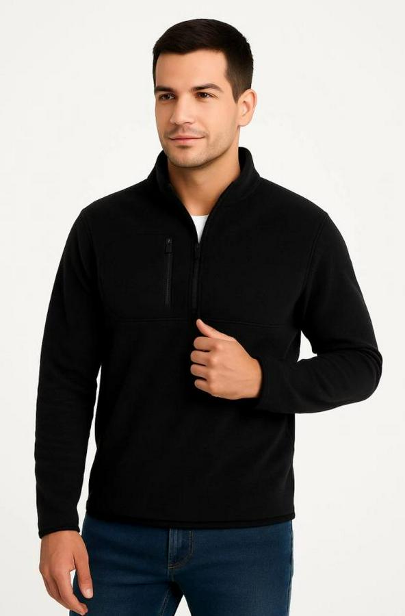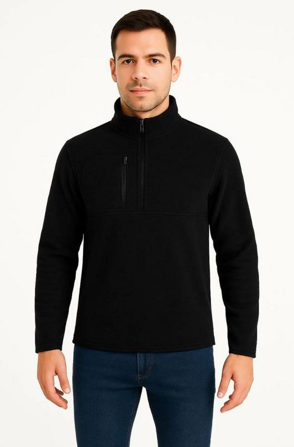Erkek Polar Kazak – Dik Yaka, Yarım Fermuarlı, Fermuarlı Göğüs Cepli, Siyah Biyeli, Kışlık Rahat Regular Fit Günlük Model - Siyah