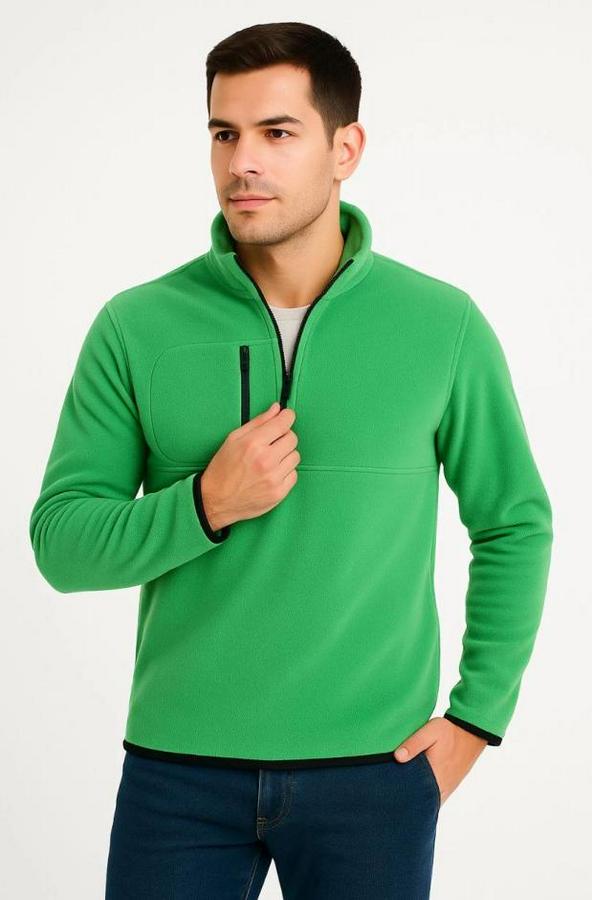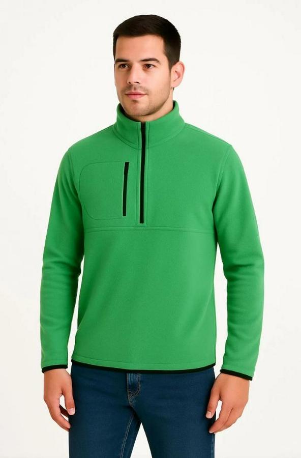 Erkek Polar Kazak – Dik Yaka, Yarım Fermuarlı, Fermuarlı Göğüs Cepli, Siyah Biyeli, Kışlık Rahat Regular Fit Günlük Model - Yeşil