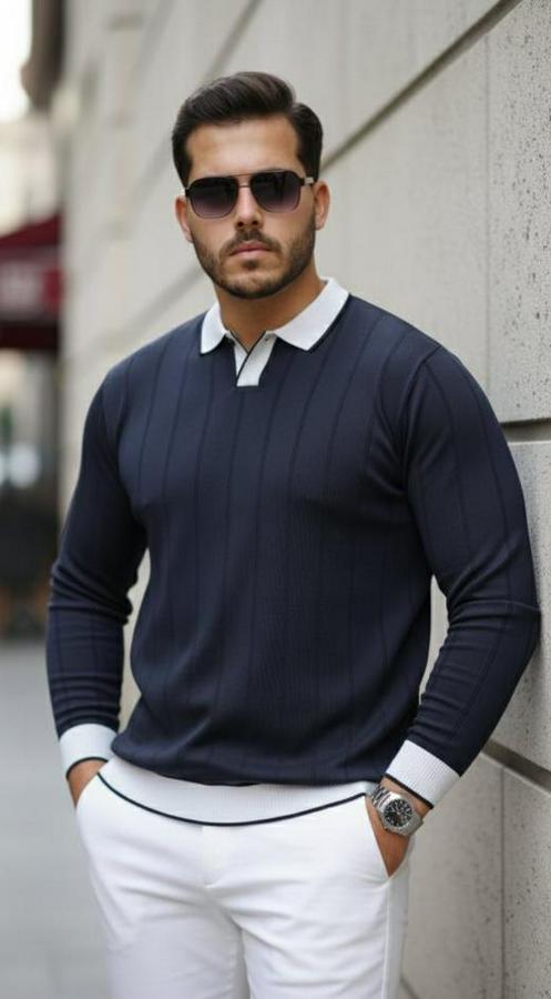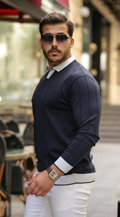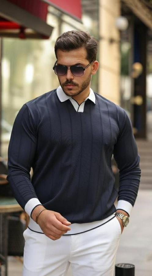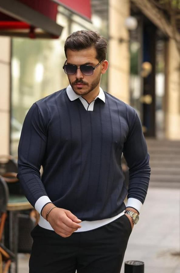 Erkek Renkli Yaka Manşet Uzun Kollu Triko