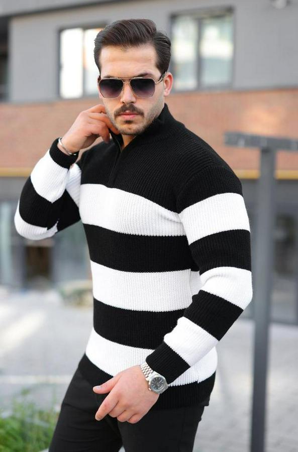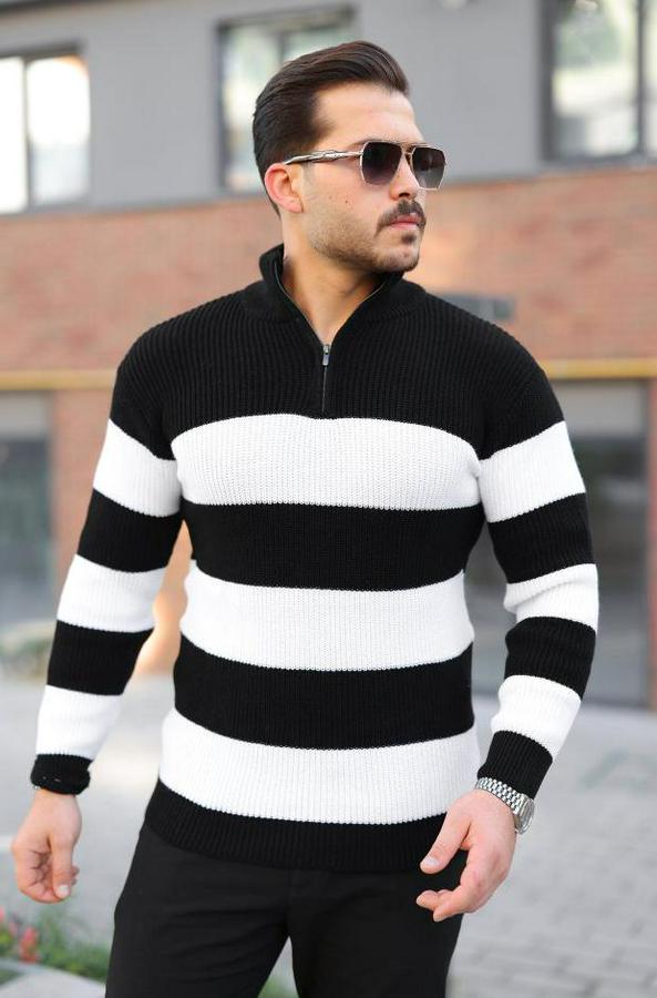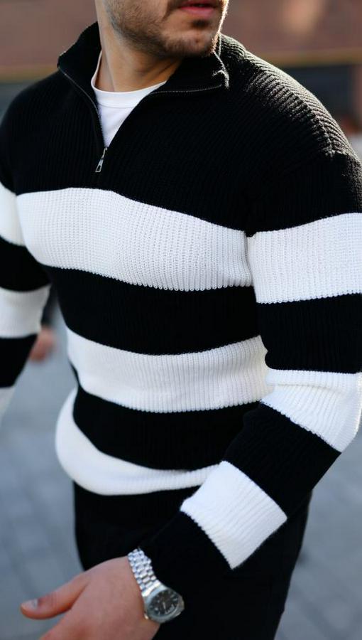 AnasayfaTüm ÜrünlerÜst GiyimKazak & HırkaKazakŞerit Renk Desenli Zip Yaka Kazak