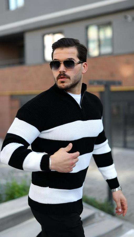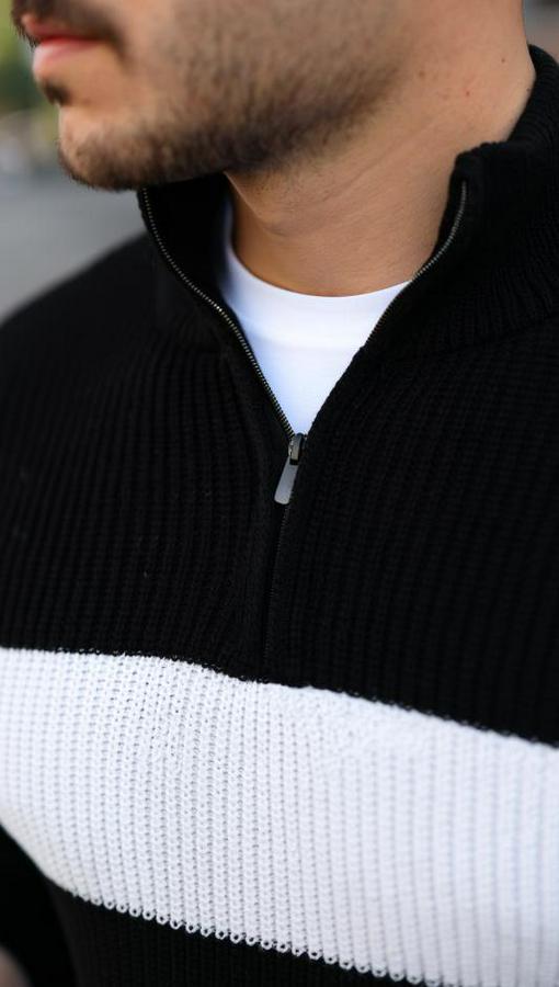 Erkek Şerit Renk Desenli Zip Yaka Kazak