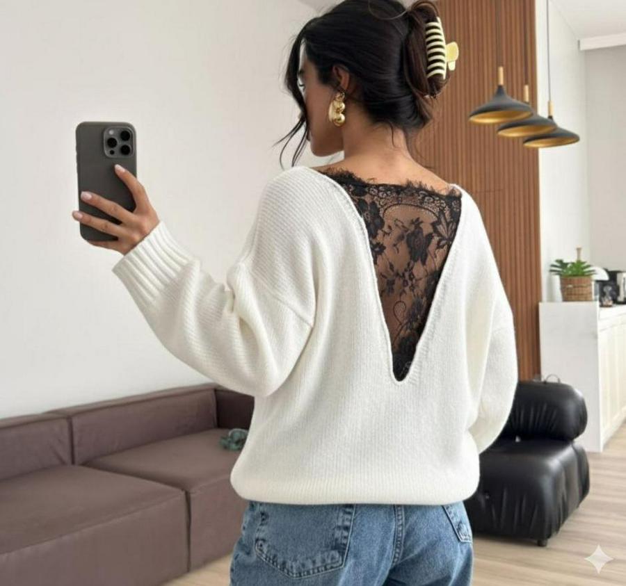 Sırtı Dantel Transparan Detay Triko Kazak