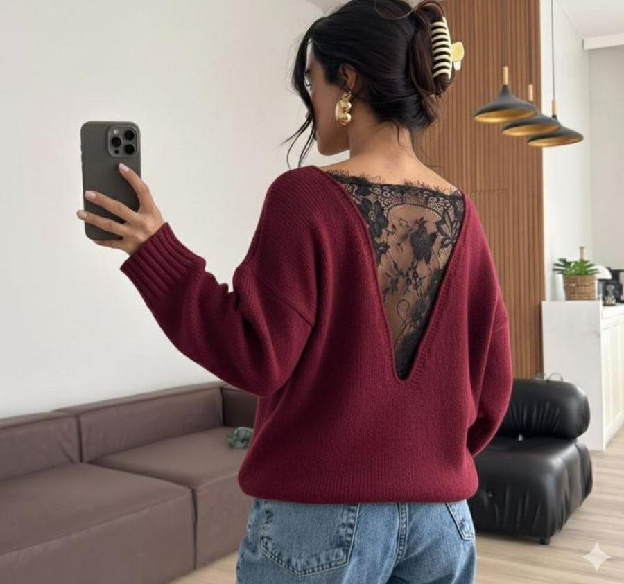 Kadın Sırtı Dantel Transparan Detay Triko Kazak