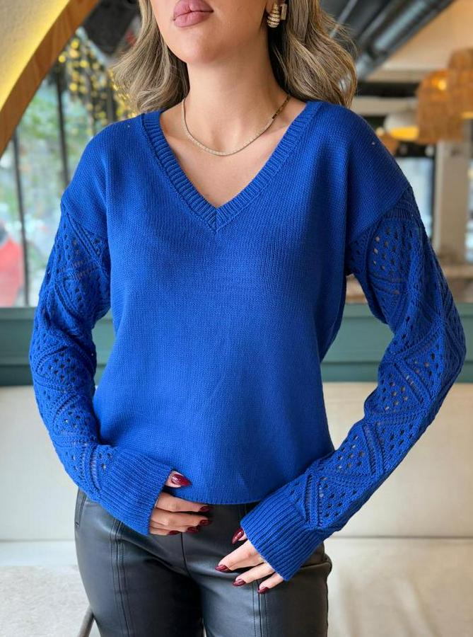 Uzun Kollu V Yaka Kol Delikli Baklava Desen Detaylı Triko Kazak