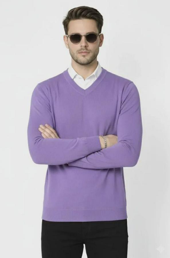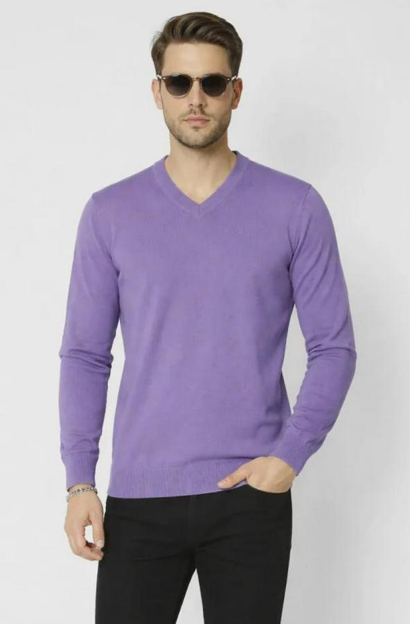 Erkek V Yaka Triko Kazak Yumuşak Dokulu Pamuklu Ince Dokuma, Uzun Kollu Rahat Regular Kalıp - Mor