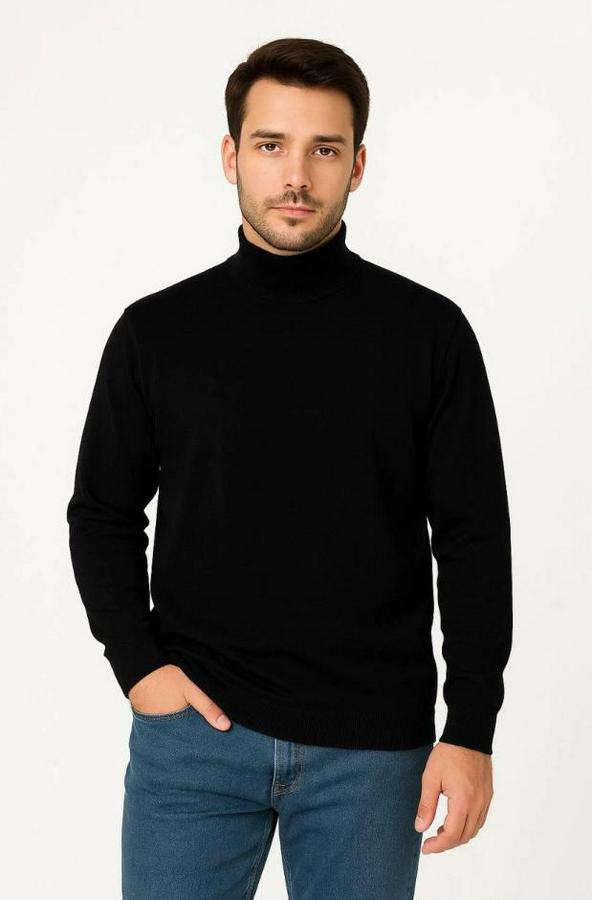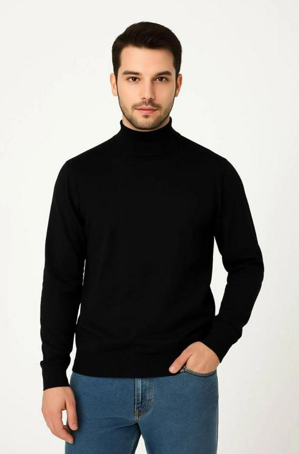 Erkek Yarım Boğaz Triko Kazak Yumuşak Dokulu Pamuklu Ince Dokuma, Uzun Kollu Rahat Regular Kalıp - Siyah