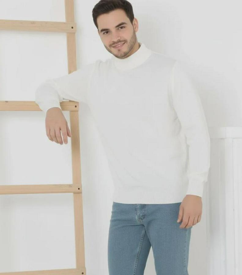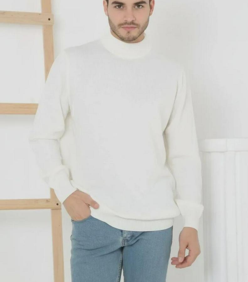 Erkek Yarım Boğaz Triko Kazak Yumuşak Dokulu Pamuklu Ince Dokuma, Uzun Kollu Rahat Regular Kalıp - Beyaz