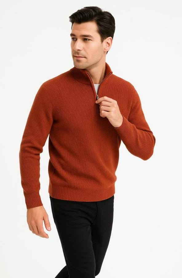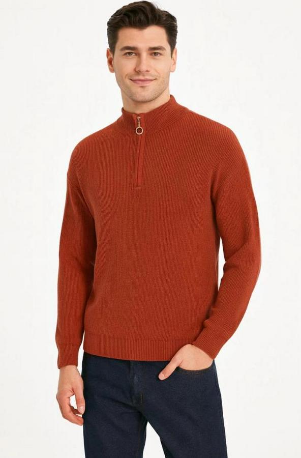 Erkek Yarım Fermuarlı Triko Kazak – Selanik Örgü, Dik Yaka, Pamuklu Dokuma, Regular Fit Uzun Kollu Kışlık Model - Kiremit