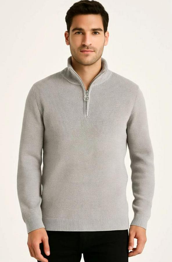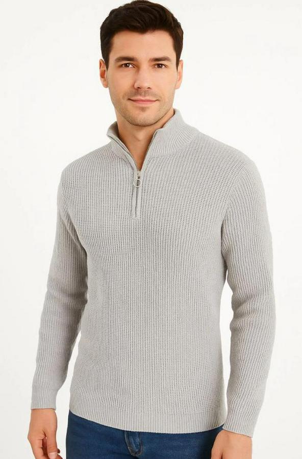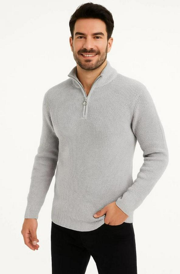 Erkek Yarım Fermuarlı Triko Kazak – Selanik Örgü, Dik Yaka, Pamuklu Dokuma, Regular Fit Uzun Kollu Kışlık Model - Gri
