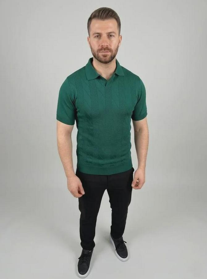 Erkek Yazlık Triko Dokuma Tişört Kısa Kol Polo Yaka T-Shirt - Koyu Yeşil