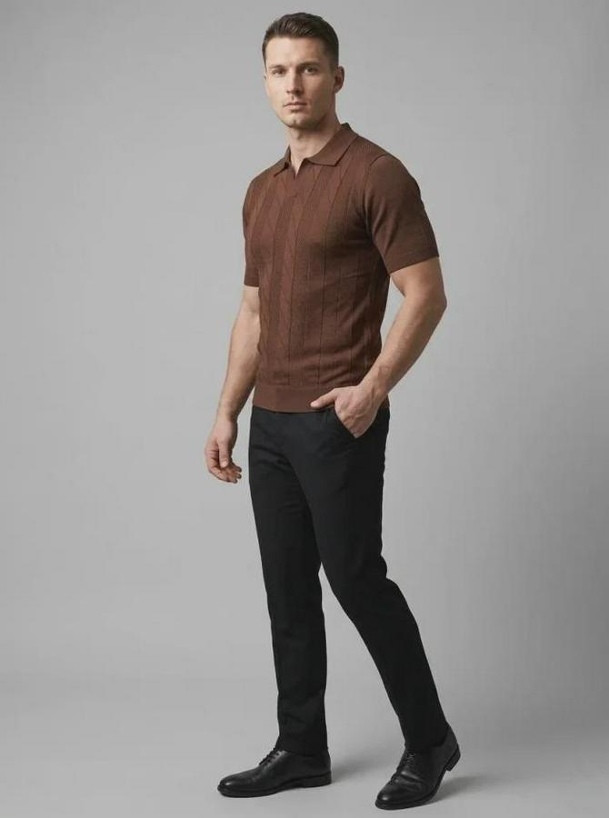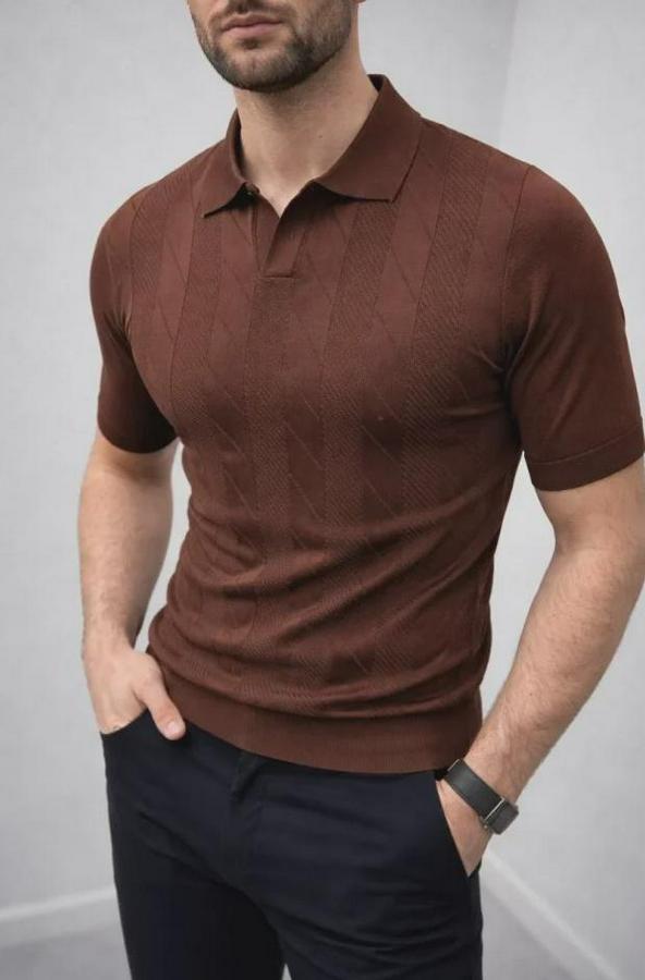 Erkek Yazlık Triko Dokuma Tişört Kısa Kol Polo Yaka T-Shirt - Kahverengi