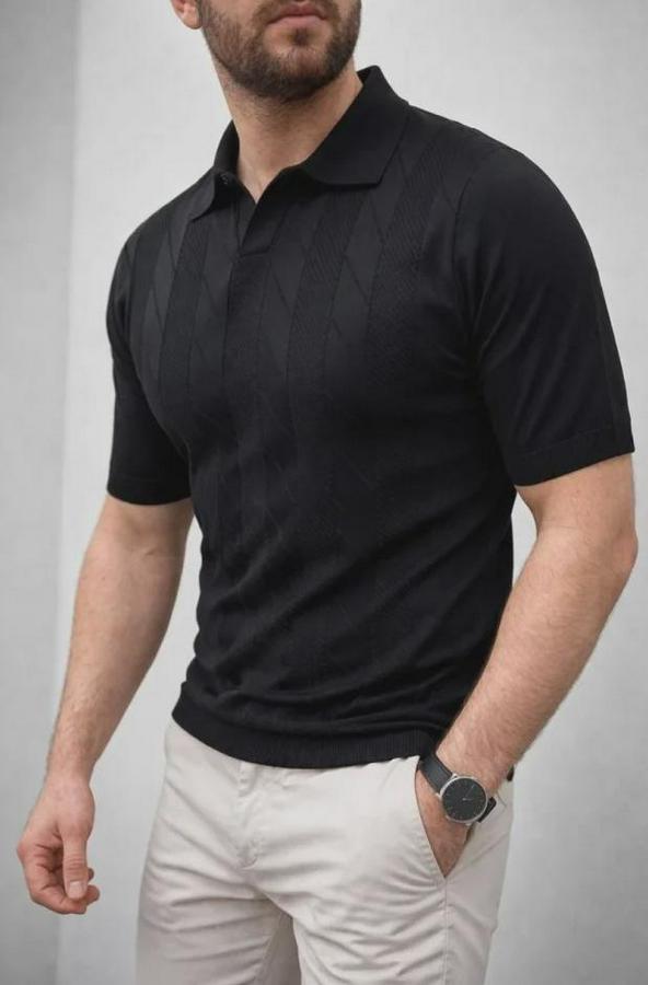 Erkek Yazlık Triko Dokuma Tişört Kısa Kol Polo Yaka T-Shirt - Siyah
