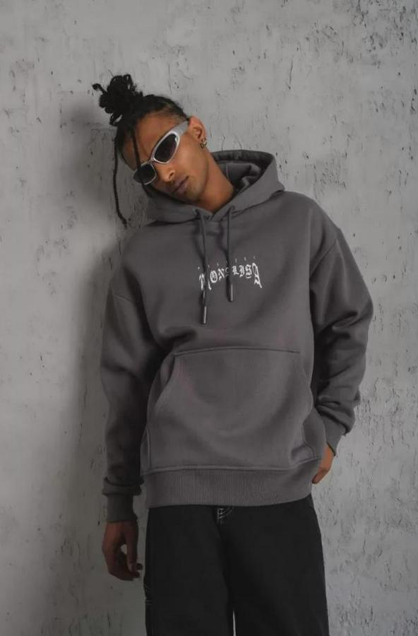Erkek Baskılı Kapüşonlu Ve Kanguru Cepli Sweat- Gri