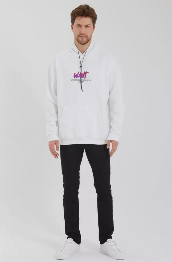 Erkek Baskılı Üç İplik Kapüşonlu Oversize Sweatshirt - Beyaz
