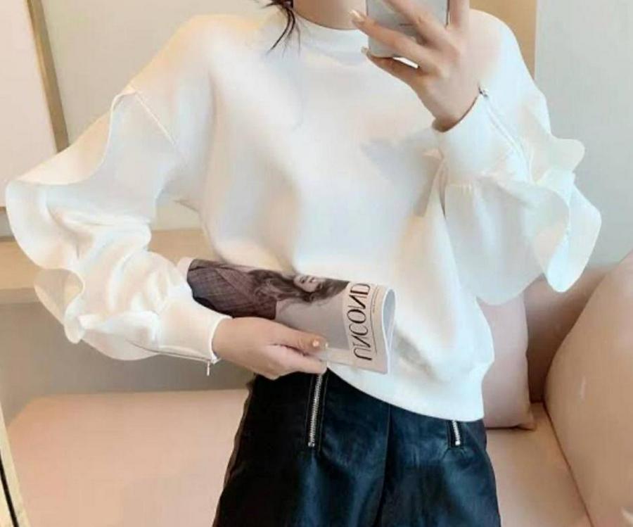 AnasayfaTüm ÜrünlerÜst GiyimSweatshirtBisiklet Yaka Kolları Volan Detay Üç Iplik Kumaş Sweat