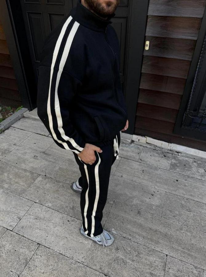 Erkek Çift Şeritli Eşofman Takım Dik Yaka Fermuarlı Sweatshirt Boru Paça Alt, Oversize 3 Iplik Pamuklu - Siyah