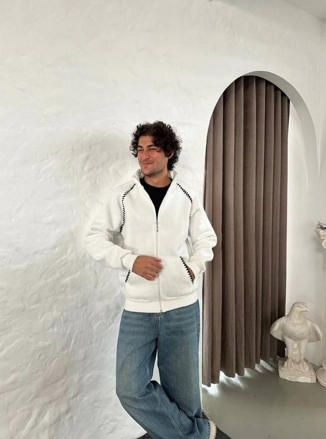 Erkek Oversize Dik Yaka Fermuarlı Sweatshirt - Zincir Nakışli Kanguru Cepli - Beyaz