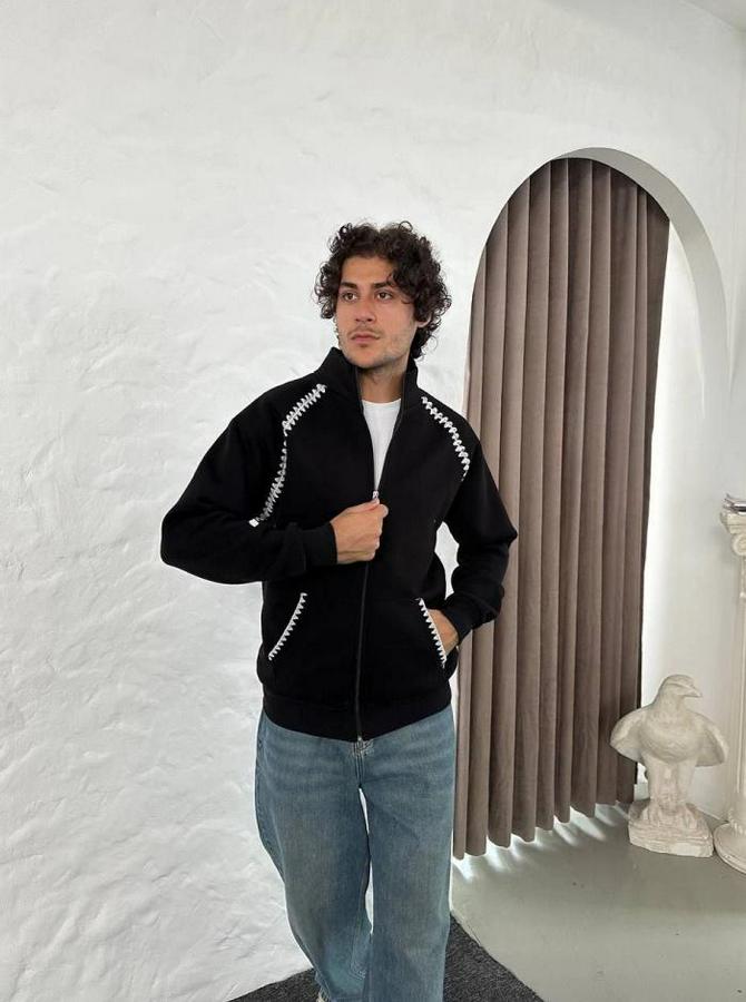 Erkek Oversize Dik Yaka Fermuarlı Sweatshirt - Zincir Nakışli Kanguru Cepli - Siyah