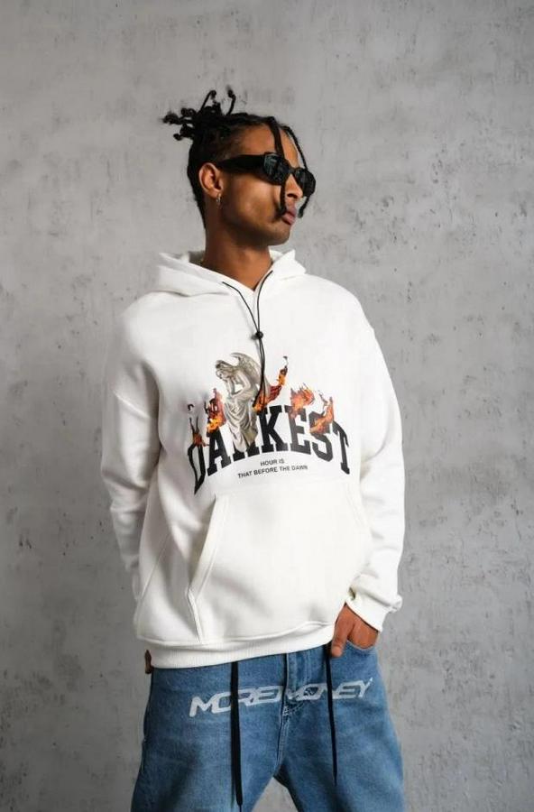 Erkek Oversize Kapüşonlu Sweatshirt – Beyaz Renk Üç İplik İçi Pamuklu Kanguru Cepli Baskılı Hoodie Rahat Kalıp Kışlık Günlük Kombinlere Uygun - Beyaz