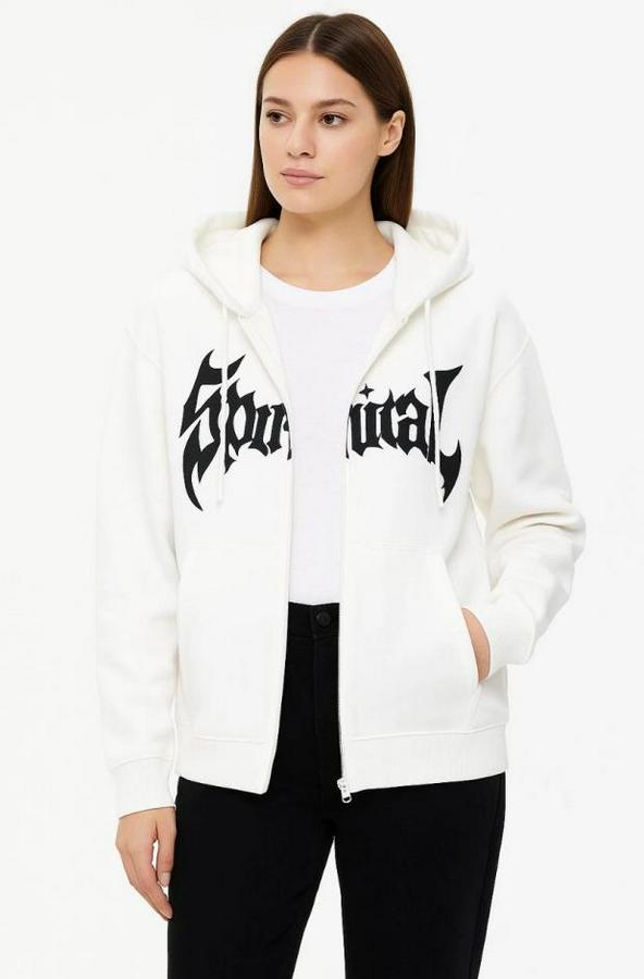 Oversize Kapüşonlu Sweatshirt Hoodie 3 İplik Şardonlu Pamuklu Kumaş, Önü Baskılı, Fermuarlı Rahat Kalıp, Kışlık Ve Sokak Stili Sweat - Beyaz