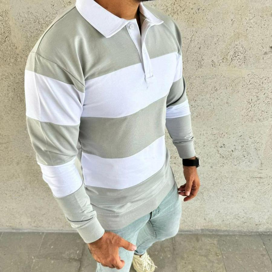 Polo Yaka Uzun Kollu Çizgili Sweatshirt Trend Rugby Stil