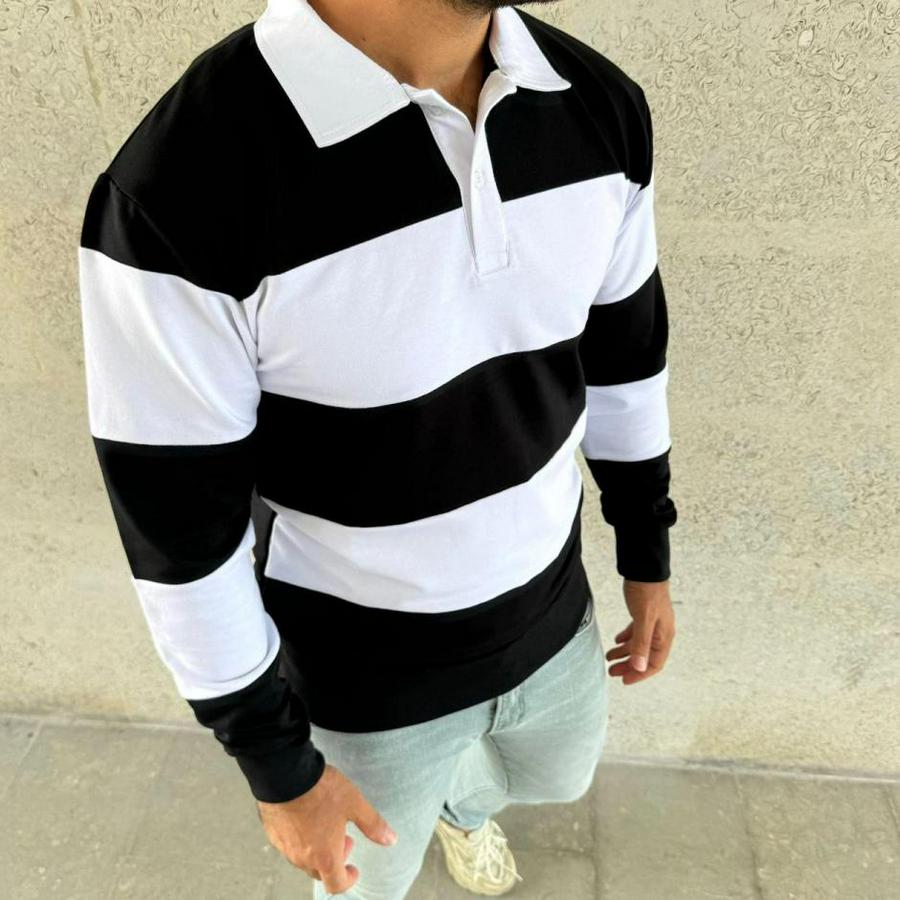 Erkek Polo Yaka Uzun Kollu Çizgili Sweatshirt Trend Rugby Stil - Siyah