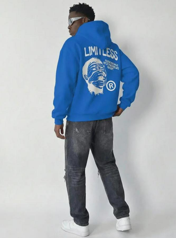 Erkek Premium Baskılı Kapşonlu Sweatshirt Üç İplik İçi Pamuklu Kanguru Cepli Double Oversize Rahat Kalıp Hoodie - Saks Mavi