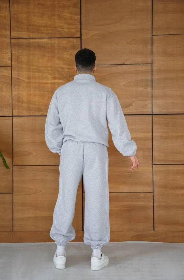 Erkek Premium Parçalı Eşofman Takım - Dik Yaka Fermuarlı Biyeli Sweatshirt Lastik Paça Alt, Oversize 3 Iplik Şardonlu - Gri
