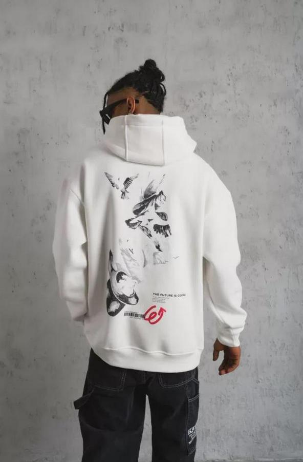 Erkek Şapkalı Güvercin Baskılı Kapşonlu Sweat - Beyaz