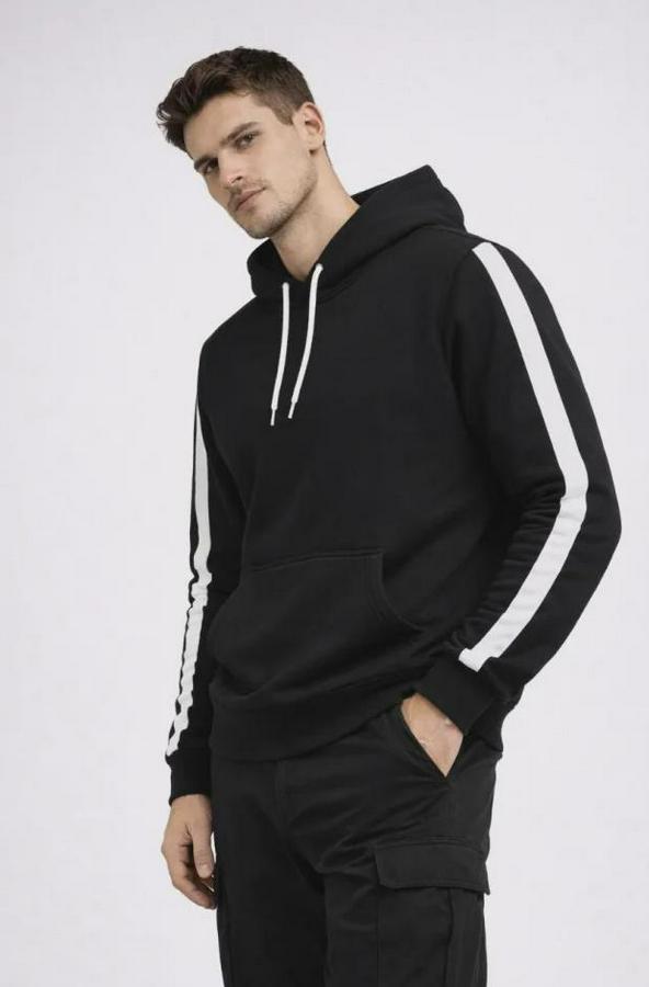 Erkek Şeritli Kapüşonlu Sweatshirt Oversize 3 Iplik Pamuklu - Siyah