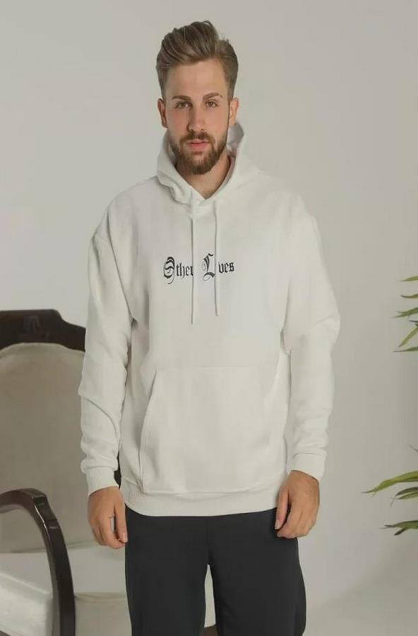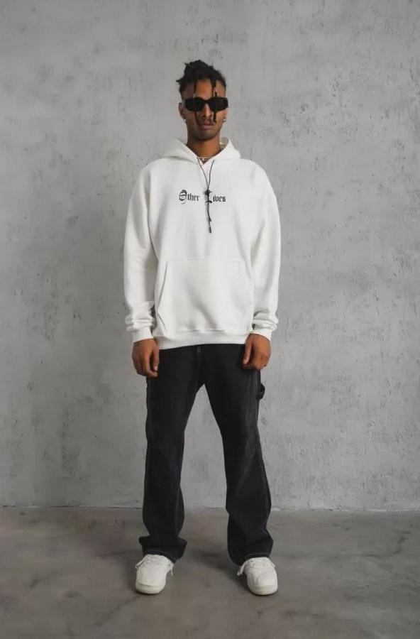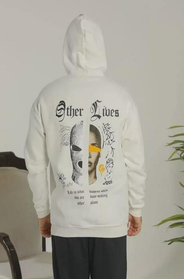 Erkek Sırt Baskılı Oversize Üç İplik Kapüşonlu Sweatshirt - Beyaz