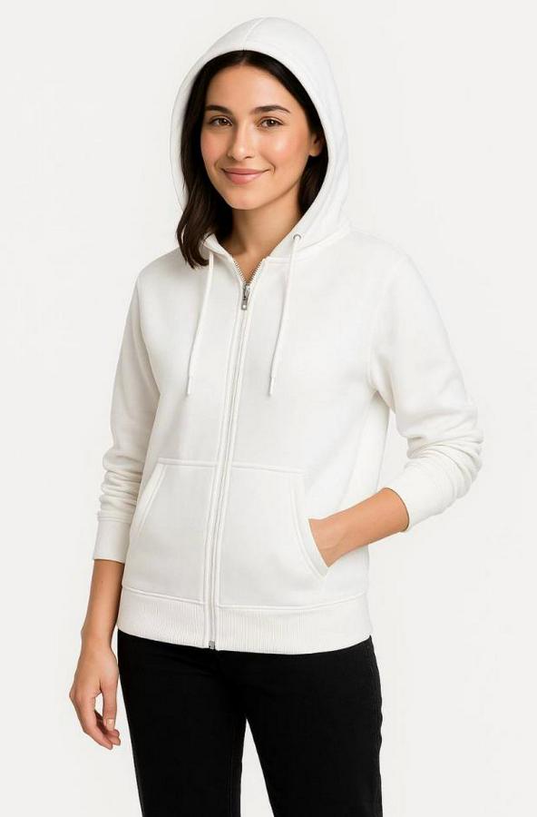 Üç İplik Kapüşonlu Tam Fermuarlı Kanguru Çepli SweatShirt Hoodie - Beyaz