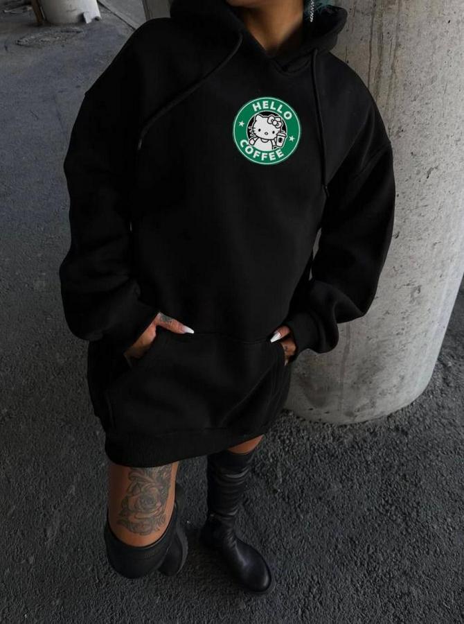 Üç İplik Penye Uzun Kol Kapşonlu SweatShirt - Siyah