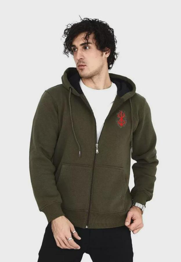 Unisex Baskılı Tam Fermuarlı Kapşonlu SweatShirt - Haki