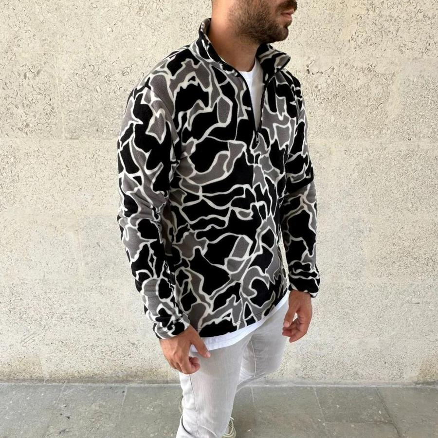 Erkek Yarım Fermuarlı Desenli Polar Sweat Yakalı, Uzun Kollu, Oversize Rahat Kalıp - Siyah