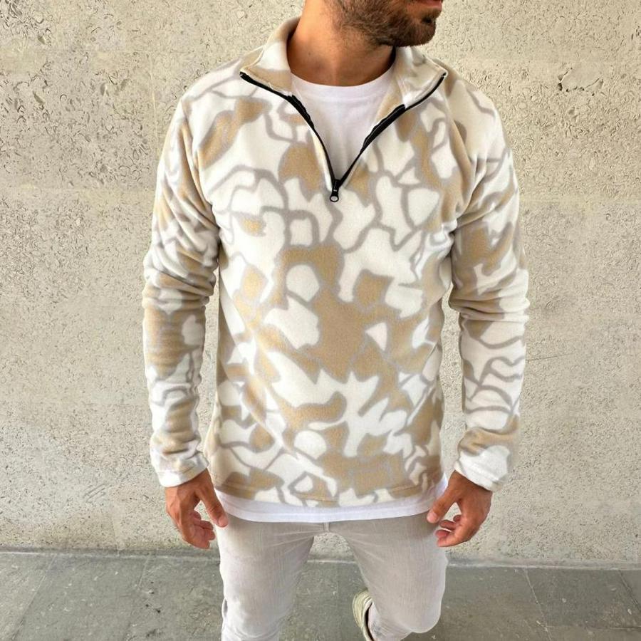 Erkek Yarım Fermuarlı Desenli Polar Sweat Yakalı, Uzun Kollu, Oversize Rahat Kalıp - Bej