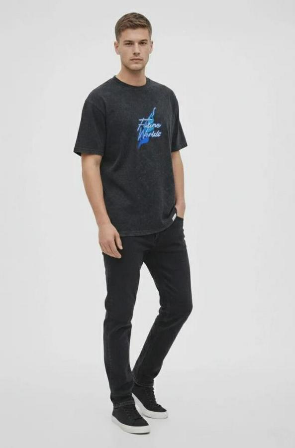 Erkek Asit Yıkamalı Oversize Tişört Future Worlds Baskılı Bisiklet Yaka Kısa Kollu Streetwear %100 Pamuk Street Style T-Shirt - Siyah