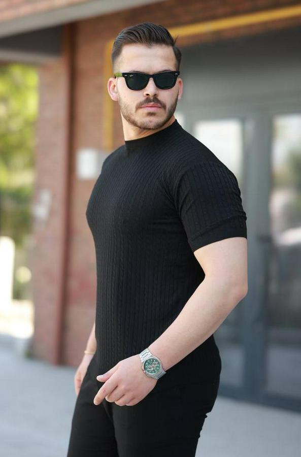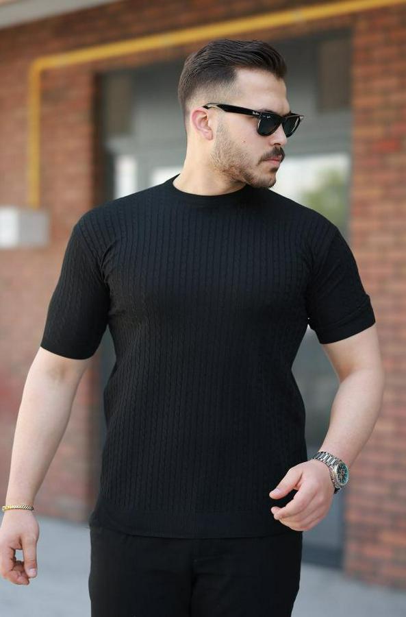 Bisiklet Yaka Örgü Desenli Kısa Örme Triko Kısa Kollu T-Shirt