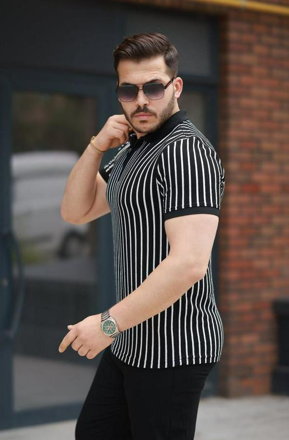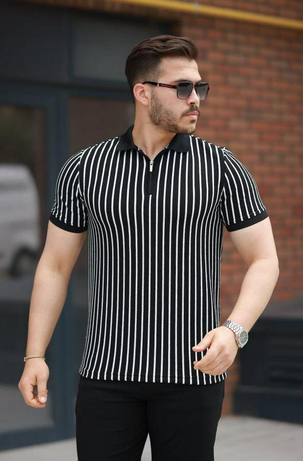 Erkek çizgili Fermuar Yakalı Kısa Kollu Tişört