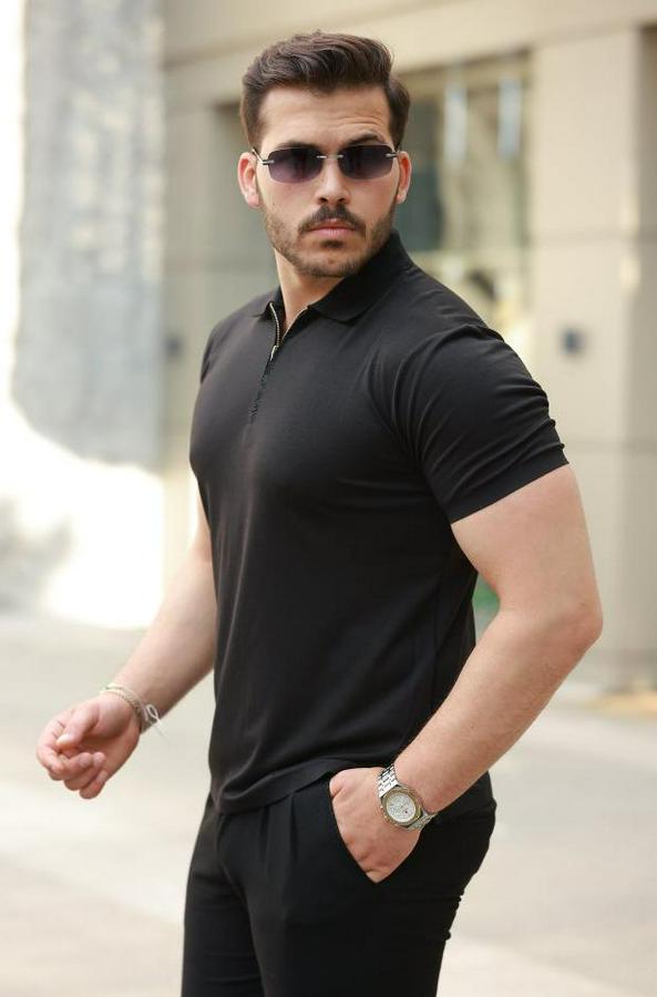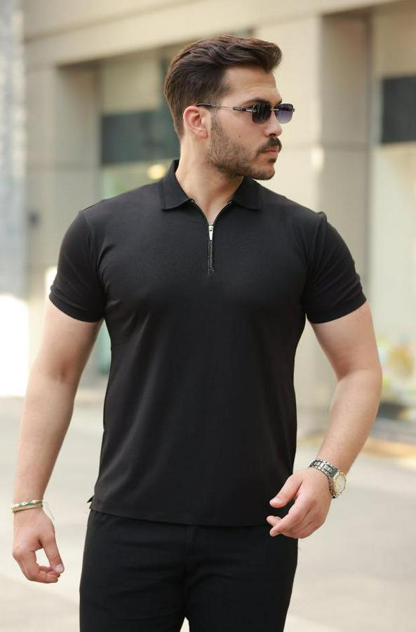 Erkek Deri Panel Detaylı Fermuar Yakalı Kısa Kollu Tişört