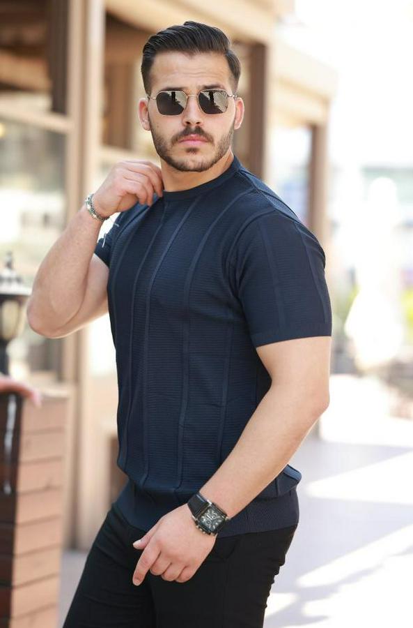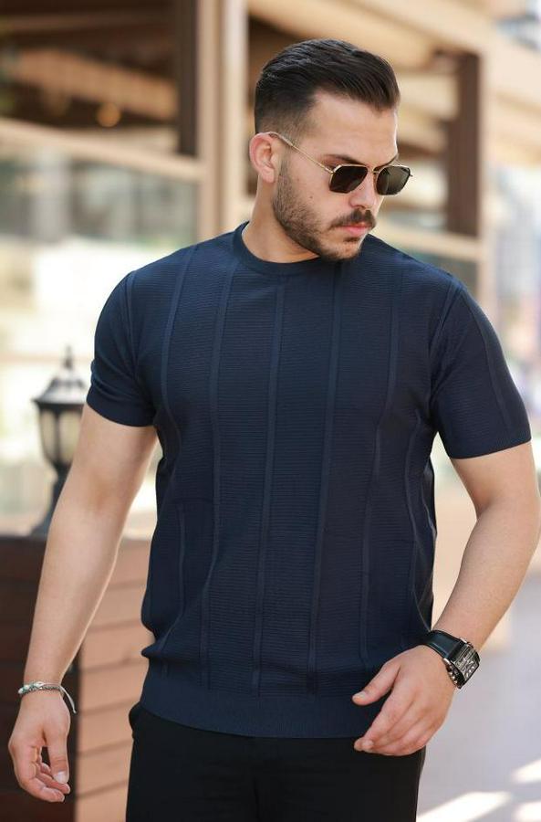 Erkek Desenli çizgi Kabartmalı Kısa Kollu Tişört