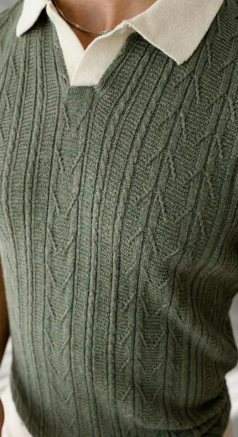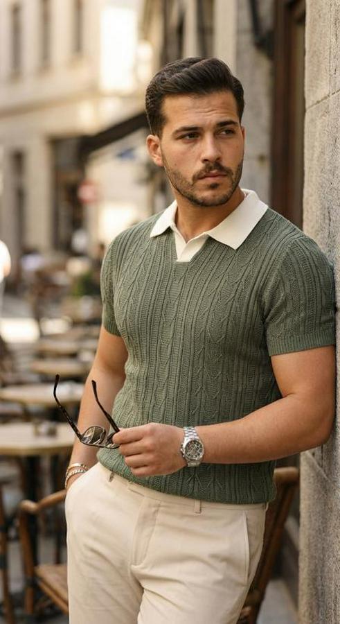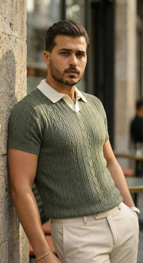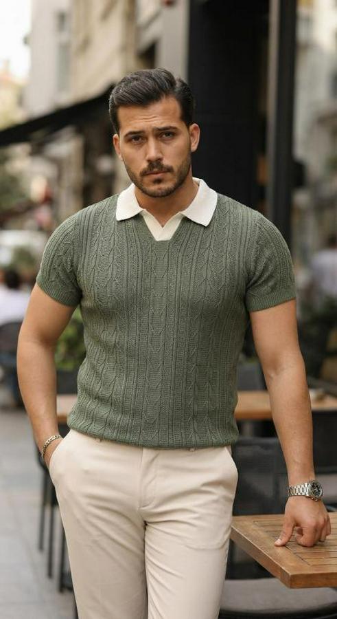 Erkek Desenli Kısa Kollu Triko Tişört - %100 Pamuk Akrilik