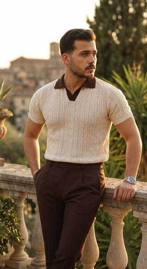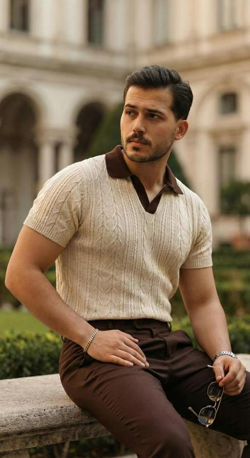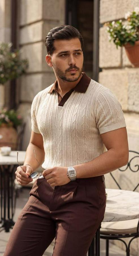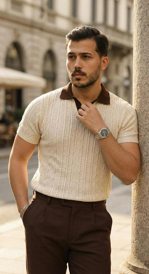 Erkek Desenli Kısa Kollu Triko Tişört - %100 Pamuk Akrilik
