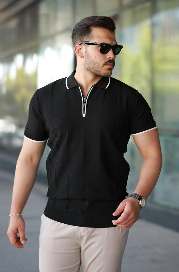 Erkek Dikey Kabartmalı Örgü Dokulu Fermuar Yakalı Tişört