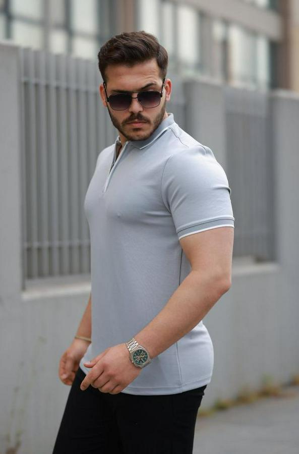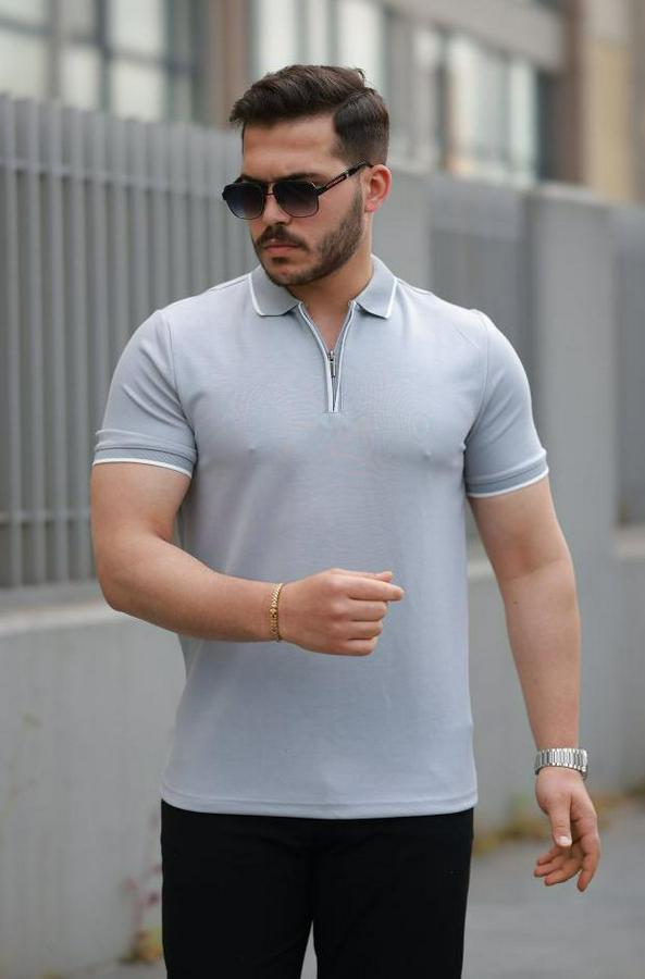 Erkek Fermuar Yakalı çizgi Detaylı Kısa Kollu Tişört