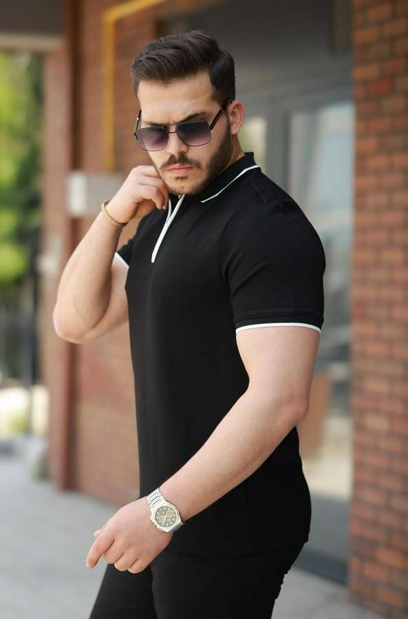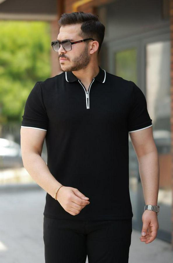 Erkek Fermuar Yakalı çizgi Detaylıkısa Kollu Tişört