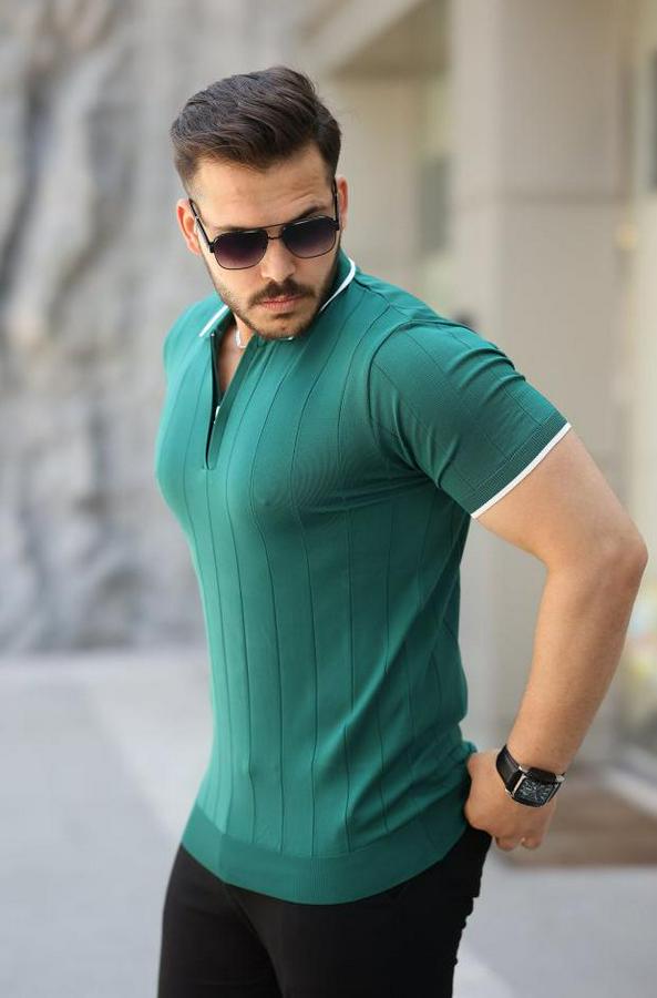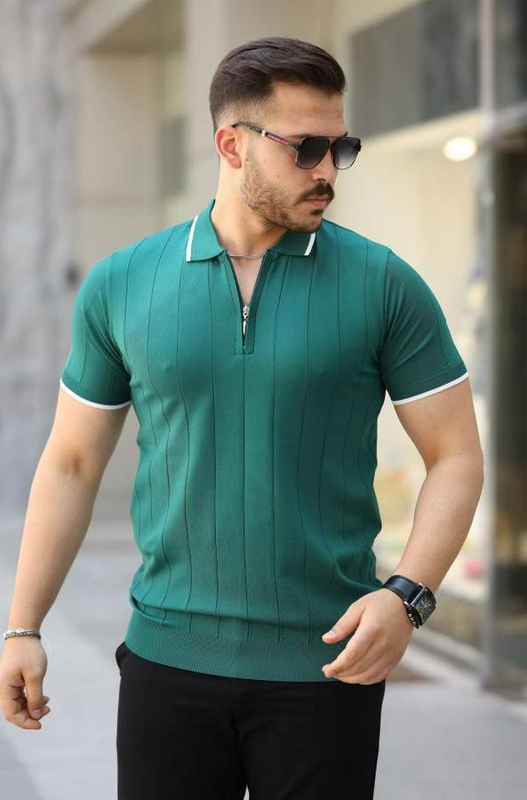 Erkek Fermuar Yakalı çizgi Dokulu Kısa Kollu Tişört