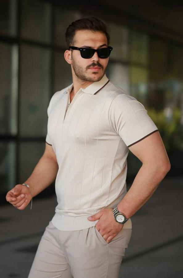 Erkek Fermuar Yakalı çizgi Dokulu Kısa Kollu Tişört