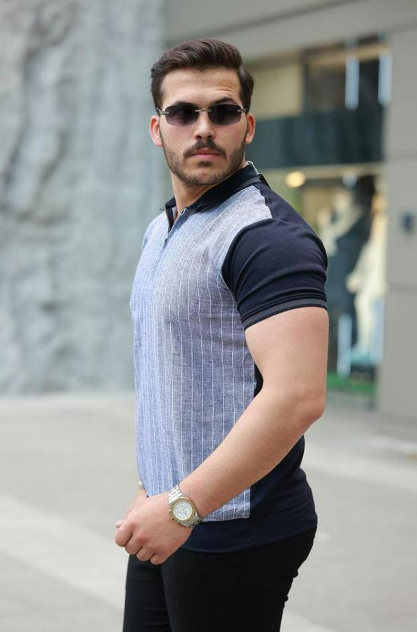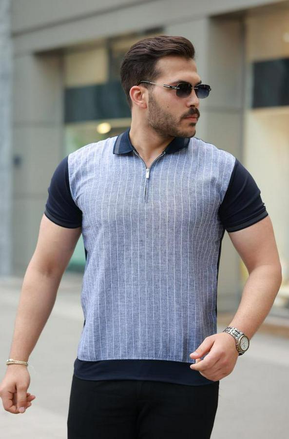 Erkek Fermuar Yakalı çizgili Kısa Kollu Tişört