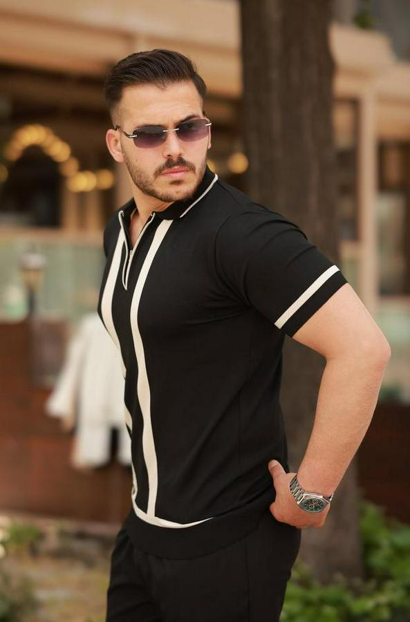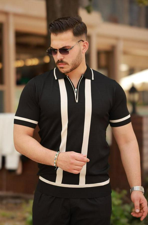 Erkek Fermuar Yakalı şerit Detaylı Kısa Kollu Tişört